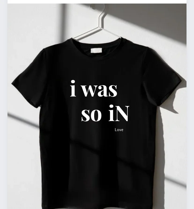 The words “I was so in love” on the front of the shirt. This is merch connected to Z Saj’s project Double Goddess the third track “Book of Brian (Smith). The t-shirt material is soft cotton.